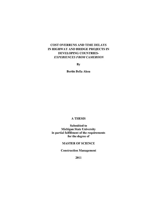COST OVERRUNS AND TIME DELAYS IN HIGHWAY AND BRIDGE PROJECTS IN DEVELOPING COUNTRIES - EXPERIENCES FROM CAMEROON By Bertin Bella AkoaCost and time performance is a concern for construction project stake-holders and specifically for highway and bridge projects, due to the uncertainty that characterizes these projects. Cost overruns and time delays have been recorded for centuries, and still occur during projects today. Despite technological innovations in project management, there has been little improvement in cost and time performance of transportation projects for over eighty years (Flyvbjerg, 2008). For developing countries, there is a need for statistically sound studies that describe cost overruns and time delays from which appropriate solutions can be derived. This research aimed to contribute to filling this gap, through case-study research at the Ministry of Public Works (MINTP) in Cameroon.Literature on cost overruns and time delays was reviewed, historical contract data was collected, and a survey was administered to construction professionals in Cameroon. After contract data analysis, it was found that projects funded by foreign aid had the largest project overrun rates, and small projects had higher project overruns. Project overrun rates decreased when project size or duration increased. Inadequate site visits during technical studies and the bidding phase for construction projects were found to be the main causes of cost overruns and time delays for MINTP. Causes of project overruns were found in all phases of project development, specifically in the bidding phase.