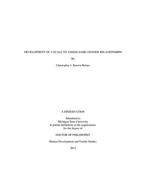 There is no empirically-based assessment instrument developed specifically for use with same-gender couples. Assessments developed with heterosexual couples present difficulty in studying same-gender couples as same-gender couples face unique challenges as a marginalized population. Most research currently available on same-gender couples is focused on the differences between heterosexual and same-gender couples. There is little unique literature exploring the relationships themselves, their characteristics or how same-gender relationships actually function. This research has attempted to bridge that gap in the literature by creating a relationship measure, the Scale for Assessing Same-Gender Relationships (SASC), based on research and theory about same-gender relationships, and empirically validating that measure with an all LG sample - something that has not been done before. The SASC was developed to assess relationship satisfaction and social support in same-gender relationships. Some items came from the Relationship Assessment Measure for Same-Sex Couples, a measure of same-gender relationship functioning that has not been well validated, with the remainder of the items coming from literature regarding adjustment and satisfaction in same-gender relationships. An online study was conducted that resulted in a total functional sample size of 295 participants. The sample was diverse in terms of geographic location, age, gender, and sexual orientation/attraction. The SASC was evaluated in Classical Test Theory analyses, as well as with Item Response Modeling. The results support the argument that the SASC is a valid and empirically sound instrument. The final version of the SASC is a 24 item, Likert-scale assessment that is capable of identifying distress in relationships, relationship satisfaction, and levels of perceived social support. Clinically, the measure is suited for use by therapists working with same-gender couples to assess levels of relationship satisfaction before, during, and after treatment. The instrument can provide researchers with an objective measure for same-gender relationship satisfaction, as well as perceived social support, an important factor in relationship functioning.