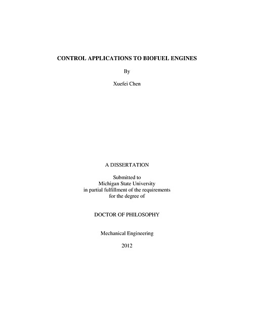 ABSTRACTCONTROL APPLICATIONS TO BIOFUEL ENGINESByXuefei ChenBiofuel, a form of renewable fuel, has promising future, especially as the alternative fuel for transportation. Biofuel is usually blended with petroleum fuel and used in flex fuel engines. Since the characteristics of biofuel are quite different from those of the petroleum based fuel, it is very important to optimize the combustion properties for biofuel engines under different fuel blends. This research focuses on biofuel content detection and combustion control of biofuel engines under different biofuel contents. The first part of this research is the utilization of the ionic polymer-metal composite (IPMC) material as a sensing element of a flow and fluid property sensor for flex fuel engines. It is motivated by the IPMC's intrinsic sensing characteristic that an IPMC beam is capable of producing an electric signal closely correlated to its mechanical movement due to the redistribution of mobile ions inside the IPMC material. The IPMC beam is modeled as multiple rigid elements connected by rotational springs and dampers in this study. The fluid properties are estimated by using the least-squares approach based upon the developed finite element model. The proposed estimation scheme was validated in experiments under different fluid media, and it was found that the estimated fluid properties have fairly good agreement with their actual values. This research is very important for automotive applications where the characteristics of the fuel blend need to be identified in real time.The second part of the research is targeted at the optimal tracking control of the desired air-to-fuel ratio (AFR) based upon adaptively estimated biofuel content for internal combustion engines equipped with the lean NOx trap (LNT) aftertreatment system. The biofuel content is adaptively estimated based upon the oxygen sensor signal. The engine system was approximated by a third order linear system. A linear quadratic optimal tracking controller was developed to track the desired engine AFR during the LNT regeneration period. The robust stability of the closed loop system with the biofuel content estimation is guaranteed over the entire biofuel content range by using the robust stability criteria for the LPV (linear parameter variation) system, where the biofuel gain and the engine speed are considered as the variable parameters. Several adaptive control schemes were studied through simulations, and then the selected control strategies were evaluated through dynamometer tests for a lean burn spark ignition (SI) engine. The best performance was achieved by the gain-scheduled adaptive scheme. The third part of the research is detection of the combustion phase and estimation of biodiesel content using traditional knock sensors. Existing approaches for the combustion phase detection of a diesel engine are mainly based upon the high cost in-cylinder pressure sensor. This study focuses on developing a method to estimate the point of 75% of mass faction burned (MFB75) by using the traditional knock sensor signal. It was observed through experiment data that the knock signal can be correlated to MFB75 location well. Therefore, an MFB75 estimation method was proposed based upon the integrated knock signal over every crank angle. The proposed approach was validated using the experimental data and provided accurate estimation of MFB75 consistently. In addition, the study also demonstrates the feasibility of using the knock sensor signal to provide a secondary estimation of fuel content.
