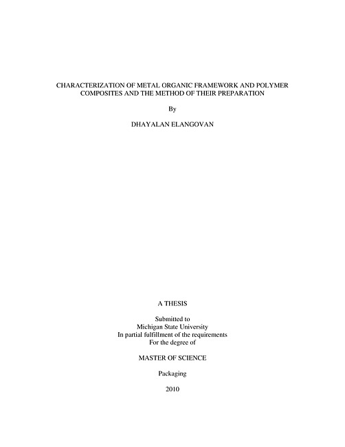 ABSTRACTCHARACTERIZATION OF METALLIC ORGANIC FRAMEWORK AND POLYLACTIC ACID COMPOSITE AND THE METHOD OF THEIR PREPARATIONByDHAYALAN ELANGOVANThe research in this paper develops biodegradable functional polyester membranes based on poly(lactic acid) (PLA) and metallic organic frameworks (MOFs). PLA without and with the addition of 1, 3, and 5 w/w % MOF was melt compounded in a twin microextruder-compounder. Disc, rectangular and dumb-bell shaped samples were produced and their optical, physical, thermal, mechanical, thermo-mechanical and barrier properties were evaluated. The PLA and MOF composites showed poor interfacial adhesion between the PLA matrix and the MOF particles, which was previously predicted by using the Hansen's solubility parameters. The FTIR, UV and colorimetric studies showed selective absorption at particular wavelengths due to the presence of the MOF. The DMA results revealed that the heat deflection temperature (HDT), storage modulus, loss modulus and Tan ∆ of the PLA/MOF composites did not change when compared to the PLA samples. However, there was a significant decrease in the brittleness of the PLA/MOF composite as evidenced by an increase of 15% in Izod impact strength and of 170% in elongation at break with respect to the PLA control samples. The permeability of PLA/MOF composite films to oxygen and water did not change when compared to the neat PLA film. However, the sorption capacity of the PLA/MOF composites films increased up to two fold at each relative humidity to which the films were exposed. The sorption and desorption curves of the PLA/MOF composite films showed a hysteresis phenomenon.