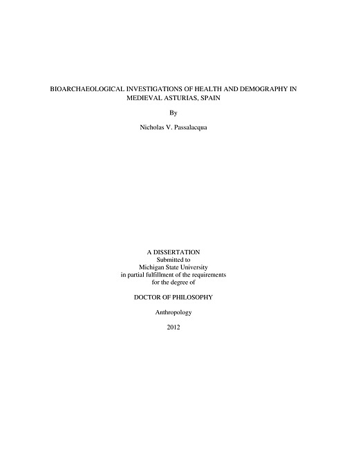 The purpose of this study is to investigate the impact of political and economic change on the health of people living in predominantly rural communities of Medieval Asturias, Spain from ~900-1800 AD. This project examines the remains of ~325 individuals recovered from 12 Medieval Christian church cemeteries located within the historically and politically defined boundaries of Asturias, Spain. Iberia has a rich written history beginning with the first Romans to enter the peninsula and describe the peoples they encountered (Collins 2000). This history became more detailed as time progressed with multiple histories of events being recorded in the Medieval Period by different parties (Linehan 1993). Unfortunately, as is common in Medieval histories, these documents concern only the key individuals involved in large political events. The average individual has no written history, nor is there an anecdotal summary of what peasant life was like in Medieval Asturias. Due to this dearth of information, this dissertation takes a historical bioarchaeology approach using what information is available from the historical narrative relating to Medieval Asturias, in order to approach issues of the economy, inferred gender, and familial status roles and their relationship to pathological markers found in the human skeletal remains of this population. Due to the often rushed nature of salvage archaeological methods, much contextual evidence was lost during excavation of many of these sites. Further the acidic mountainous soils of Asturias often result in poorly preserved skeletal material. Here these pitfalls will be addressed using two unique approaches: (1) this project will examine life histories of the general rural population of Medieval Asturias at the regional level. This will be achieved by aggregating all individuals from the available archaeological sites, and directing hypotheses at regularities at the regional scale. (2) In order to tackle the issue of poor or differential preservation of human remains, this project will employ new maximum likelihood statistical procedures specifically designed to handle missing data and generate probability statements. It should be noted that while the robust statistical approaches taken here will focus on region-level analyses, they could also be applied to large well documented sites in future investigations. Results demonstrate that while historians (e.g. Kamen 1991; Lynch 1992; Ortiz 1971; Ruiz 2007) suggest rampant collapse and crisis throughout much of the later Medieval and Spanish Empire periods, the biology of the individuals from the same time shows no record of significant increases in stress or disease. Many other scholars (e.g. Bennett 2005; Miller 2003; Lopez et al. 2012) suggest the patriarchal nature of Medieval and Imperial Spain resulted in negative health outcomes for females in comparison to their male counterparts, but this is again not detected in the present examination of the skeletal biology. Finally, historians (e.g. Bango Toviso 1992) and mortuary anthropologists (e.g. Naji 2005; Ivison 1993; Effros 1997) alike argue that the practice of ad sanctos burial favored those high status individuals who were most regarded in the community, for prestigious burial locations within churches, but these results found no significant differences in terms of mortality (risk of dying at younger ages) or the development of physiological stress markers.