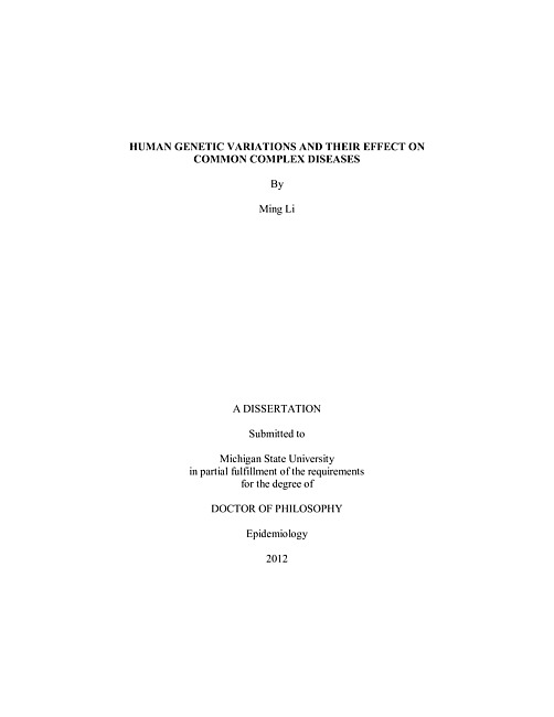 BACKGROUND: The genetic etiology of common complex diseases has been extensively studied during the past few years. Though many causal genetic variants have been identified, they account for only a small percentage of the estimated heritability of complex diseases, such as breast cancer and cigarette smoking. It remains an open question about where the unexplained heritability lies and how to find it. The objective of this dissertation research is to examine three possible sources of such unexplained heritability: 1) the association between copy number variants and breast cancer, 2) the association between gene-gene interactions and cigarette smoking, and 3) the association between functional rare variants and a simulated quantitative trait. METHODS: To detect copy number variants in breast cancer, we examine a breast cancer dataset from the National Cancer Institute and apply a hidden Markov model. To detect gene-gene interactions that are associated with cigarette smoking, we examine a genome-wide dataset from the Study of Addiction: Genetics and Environment and apply a forward U-test. To detect functional rare variants, we examine a dataset from Genetic Analysis Workshop 17 and apply an aggregating U-test. RESULTS: In the breast cancer study, we detect five genomic regions on chromosome 2, 4, 6, 12, and 13. In the cigarette smoking study, we detect two single nucleotide polymorphisms (SNPs) with potential interactions. These two SNPs are located in genes CHRNA5 and NTRK2. In the quantitative trait study, we show that the aggregating U-test has a greater power to detect functional rare variants than a commonly used approach, QuTie. CONCLUSIONS: Our findings from the breast cancer study suggest that structural changes of these genomic regions may contribute to the development of breast cancer. Our findings from the cigarette smoking study indicate that the joint action between genes CHRNA5 and NTRK2 may contribute to the development of cigarette smoking behavior. These proposed methods provide useful tools to detect various types of human genetic variations underlying complex diseases.
