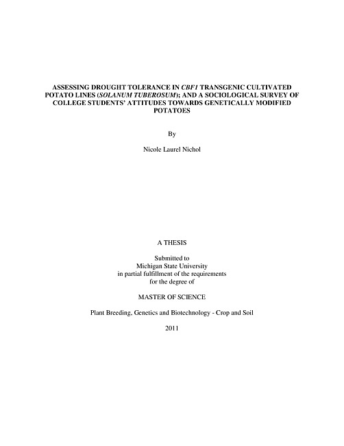 Assessing drought tolerance in CBF1 transgenic cultivated potato lines (solanum tuberosum); and a sociological survey of college students' attitudes towards genetically modified potatoes