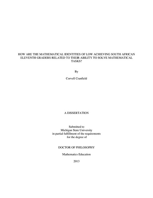 ABSTRACTHOW ARE THE MATHEMATICAL IDENTITIES OF LOW ACHIEVING SOUTH AFRICAN ELEVENTH GRADERS RELATED TO THEIR ABILITY TO SOLVE MATHEMATICAL TASKS?ByCorvell Cranfield The construct of mathematical identity has recently been widely used in mathematics education with the intention to understand how students relate to and engage (or disengage) with mathematics. Grootenboer and Zevenbergen (2008) define mathematical identity as the students' knowledge, abilities, skills, beliefs, dispositions, attitudes and emotions, that relates to mathematics and mathematics learning. A key part of this relationship that students have with mathematics is the students' evolving sense of self to understand how mathematics fits with this self (Black et al, 2010). Research shows that students' identity has many facets or multiple identities that are formed throughout their life history; engagement with their peers, family, and teachers; as well as engagement with mathematical tasks. Doing mathematics can be viewed as mathematical activity that involves integrating mathematical thinking by using mathematical facts and knowledge, and requires active student learning. Mathematical tasks used in the classroom form the basis for student's learning (Doyle, 1988) and different tasks are used to develop different types of skills and thinking (QCDA report). These tasks often appear in curricular or instructional materials in textbooks and should be within the current experiential space of students (Jurdak, 2008).This study investigated how the mathematical identities of low achieving South African eleventh graders are related to their ability to solve mathematical tasks. I used a variety of methods including mathematical stories, biographical interviews, focus-group interviews, mathematical tasks, and clinical interviews. These methods were used to investigate the salient features of mathematical identity, the performance in mathematical tasks, and the relationship between mathematical identity and mathematical performance. This case study focused on five eleventh graders who were underperforming in mathematics at a low-socioeconomic school located in a working class community in the Western Cape Province in South Africa. The framework for analysis used concepts from Leont'ev's (1981) cultural historical activity theory, but build on the construct of a `leading identity', which formed the basis for the study's theory of identity (Black et al., 2010). This notion of leading identity suggests a hierarchy of motives, with the most significant motive forming the leading identity. My results show that the relationship between math identity and math performance are characterized by "discontinuities and continuities" (Stentoft & Valero, 2009) between these two components. This conceptualization helped in understanding and explaining the fragility of mathematical identity as produced in practice. I discuss the implications of this relationship between math identity and math performance for future research, teachers, and math education.