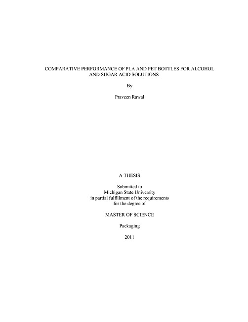 Comparative performance of PLA and PET bottles for alcohol and sugar acid solution
