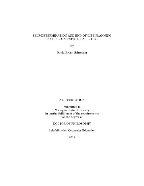 ABSTRACTSelf-Determination and End of Life Planning for Persons with DisabilitiesByDavid Bryan Schroeder For nearly a half century, self-determination has been a prominent topic for discussion within the field of disability, and prevalent within the research literature (Bekemeier, 2009). Disability literature is clear regarding the value on the voice of the people with disabilities (PWD) to guide and direct their own lives as they see fit (Moye, Wood, Edelstein, Arnesto, Harrison & Wood, 2007). Despite this high value, many PWD continue to experience interventions, in the form of legal maneuvering, that seek to strip them of legal rights and responsibilities for their own decision making (Black, 2008). Guardianship and conservatorship are the most common methods used to take control of another's life, and leave PWD voiceless to control the events in their lives (Black, 2008). Often, these decisions are made in response to a crisis, at a time when PWD may be unable to carefully consider and communicate their preferences (Black, 2008). Concerns regarding the use of guardianship and conservatorship have been increasingly reported in the media, practices and ethics have come under intensive scrutiny (Paillaud, Ferrand, Lejonc, Henry, Boullianne, & Montagne, 2007). The ability to appoint proxies to serve in times when an individual is unable to relay their desires has been codified with the introduction of the Patient Self Determination Act and expanded with the Uniform Healthcare Decisions Act (Galambos, 1998). The study proposed seeks to determine the relationship between constructs of self determination and engagement in the creation of a durable power of attorney for healthcare among persons with disabilities served by Centers for Independent Living in Lansing, Michigan and Lubbock, Texas. The study will utilize a well developed survey to measure the presence of self-determined behaviors and a created survey regarding the creation of a durable powers of attorney document. The created `Participant Planning Questionnaire' will additionally seek information regarding the interest of respondents in learning more about the durable powers of attorney creation process. Demographic information will be gathered to allow for description of the respondent population.