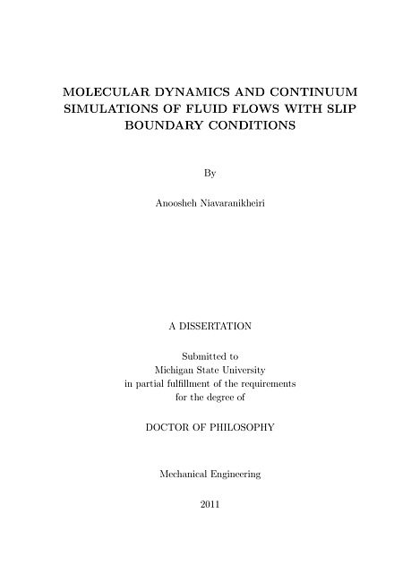 Microfluidics is a rapidly developing field with applicationsranging from molecular biology, environmental monitoring, andclinical diagnostics. Microfluidic systems are characterized bylarge surface-to-volume ratios, and, therefore, fluid flows aresignificantly influenced by boundary conditions. The fundamentalassumption in fluid mechanics is the no-slip boundary condition,which states that the tangential fluid velocity is equal to theadjacent wall speed. Although this assumption is successful indescribing fluid flows on macroscopic length scales, recentexperimental and numerical studies have shown that it breaks down atmicroscopic scales due to the possibility of slip of the fluidrelative to the wall. The effect of slip is more pronounced forhighly viscous liquids like polymer melts or in the region near themoving contact line due to the large gradient in shear stress at theliquid/solid interface. The measure of slip is the so-called sliplength, which is defined as a distance between the real interfaceand imaginary plane where the extrapolated velocity profilevanishes. The slip length value is sensitive to several keyparameters, such as surface energy, surface roughness, fluidstructure, and shear rate.In this dissertation, the slip phenomena in thin liquid filmsconfined by either flat or structured surfaces are investigated bymolecular dynamics (MD) and continuum simulations. It is found thatfor flows of both monatomic and polymeric fluids over smoothsurfaces, the slip length depends nonlinearly on shear rate atsufficiently high rates. The laminar flow away from a curvedboundary is usually described by means of the effective slip length,which is defined with respect to the mean roughness height. MDsimulations show that for corrugated surfaces with wavelength largerthan the size of polymer chains, the effective slip length decreasesmonotonically with increasing corrugation amplitude. A detailedcomparison between the solution of the Navier-Stokes equation withthe local rate-dependent slip condition and results of MDsimulations indicates that there is excellent agreement between thevelocity profiles and the effective slip lengths at low shear rateand small-scale surface roughness. It was found that the main causeof the slight discrepancy between MD and continuum results at highshear rates is the reduction of the local slip length in the higherpressure regions where the boundary slope becomes relatively largewith respect to the mainstream flow. It was further shown that forthe Stokes flow with the local no-slip boundary condition, theeffective slip length decreases with increasing corrugationamplitude and a flow circulation is developed in sufficiently deepgrooves. Analysis of a numerical solution of the Navier-Stokesequation with the local slip condition shows that the inertialeffects promote the asymmetric vortex flow formation and reduce theeffective slip length.