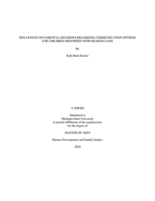 ABSTRACTINFLUENCES ON PARENTAL DECISIONS REGARDING COMMUNICATION OPTIONS FOR CHILDREN IDENTIFIED WITH HEARING LOSSByKalli Beth DeckerChoosing a method of communication for a child who is deaf or hard of hearing (d/hh) is a complex process that must be addressed early in order to avoid severe developmental consequences. Limited research shows that parents' decisions are influenced by professionals who are often biased toward a particular communication method, and that parental attitudes and knowledge related to their child's development may also be influential. This study addresses a gap in the literature by investigating potential influences on parents' choices of a communication method including parents' knowledge of communication development, values, and sources of information. Data were collected via an online survey for parents of children who are d/hh (N = 36). Findings indicate that there were no differences between parents who chose an oral versus signed method of communication in their knowledge of communication development or their perceptions of the media's portrayal of children who are d/hh. However, parents who chose an oral communication method placed higher value on their child's ability to fit in with typically developing children, felt more negatively about their own abilities to learn or use a signed method of communication, and sought information from education or speech/audiology professionals more often. However, there were no group differences in sources parents cited as influential to their decisions. Instead, all parents reported relying on their own judgment, indicating that they had internalized the opinions of the professionals from whom they had sought information.