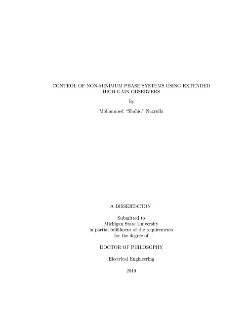 Control schemes that achieve stabilization and output regulation in the case of non-minimum phase nonlinear systems are presented. These techniques utilize continuously implemented sliding mode control, and an extended high-gain observer to generate estimates of the output and its first ρ - 1 derivatives (ρ is the relative degree of the system), in addition to a signal that renders the zero dynamics of the given plant observable. The results include exponential stability of the origin of the output feedback system in the stabilization problem, exponential stability of the origin of the error system in the regulation problem, and asymptotic recovery of the performance of the state feedback designs in both instances.The stabilization and regulation problems pose unique challenges in the case of non-minimum phase nonlinear systems. This work provides a design methodology that can be incorporated into any robust control scheme. The design process conforms to the nonlinear separation principle, and comprises the following three steps.1) Augment a dynamic stabilizing compensator to the system and moreover, design it such that the resultant system is minimum phase and relative degree one with respect to a virtual output to be constructed using the state estimates.2) Use any robust control technique such as sliding mode control, saturated high-gain feedback, Lyapunov redesign, etc. to design a static state feedback control law that stabilizes the relative degree one minimum phase system obtained in the previous step.3) Design an extended high-gain observer (EHGO) to estimate the system output and its first ρ - 1 derivatives, and additionally, the coupling signal that is required to solve the auxiliary design problem stemming from step 1). Replace all the states and the coupling signal in the state feedback control design with their estimates, and if necessary, saturate the resulting control law outside a compact set of interest, or saturate the estimates obtained from the EHGO.Simulation examples are provided — in particular, the stabilization algorithm is applied to the Translational Oscillator with a Rotating Actuator (TORA) nonlinear benchmark system.