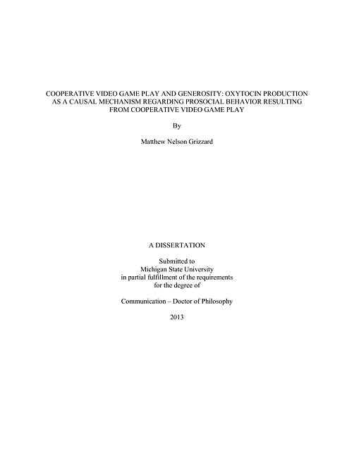 Cooperative video game play and generosity : oxytocin production as a causal mechanism regarding prosocial behavior resulting from cooperative video game play