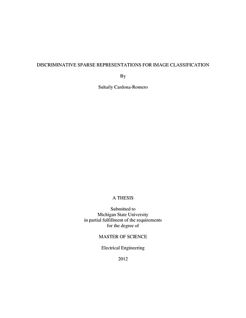 ABSTRACTDISCRIMINATIVE SPARSE REPRESENTATIONS FOR IMAGE CLASSIFICATIONBySuhaily Cardona-Romero Sparse representations and compressed sensing (CS) are two methods that have drawn the attention of the signal processing community due to their ability to reduce the dimensionality of signals while preserving enough information for signal representation. However, these compact representations do not necessarily preserve the most discriminative aspects of the signal. This thesis addresses this issue by developing a new discriminative framework to obtain a compact representation with high discriminative information for image classification applications. The first part of this thesis presents a greedy algorithm inspired by CoSaMP with the inclusion of a new cost function that quantifies the tradeoff between discrimination power and sparsity. The inclusion of this cost function helps to select a small number of atoms from an overcomplete dictionary that produces discriminative sparse representations of images from different classes. Through experiments, it was shown that such representations can be used as features to classify new sample images even under noisy environments or missing pixels. The second part of this thesis proposes a method to obtain discriminative measurements from CS and is motivated by the fact that the presence of irrelevant features may reduce the classification accuracy. To address this issue, a feature selection step was added to CS to eliminate irrelevant features from the measurements. As a result of the elimination of such features, an improvement in the classification accuracy is observed. In conclusion, it was demonstrated that a subset of incoherent projections with high discrimination power performs better than the whole set of CS measurements for classification purposes.