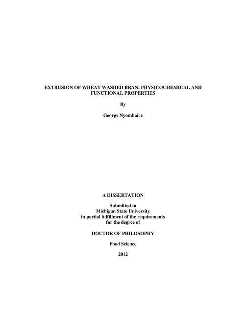 Milled wheat bran contains substantial amounts of residual starchy endosperm that may interfere with the analyses that are used to determine a bran's composition and physicochemical properties. In addition, it is possible that during extrusion cooking, this residual starchy endosperm may undergo certain chemical modifications that may affect composition, physicochemical properties, and functionality of wheat bran. Therefore, the objectives of the present study were: (1) to develop a method that removes most of the residual starchy endosperm still adherent to milled wheat bran, (2) to investigate the effects of particle size of non-washed and washed wheat bran coupled with extrusion processing conditions on total dietary fiber, insoluble dietary fiber, and soluble dietary fiber contents of non-washed and washed bran, (3) to investigate the effects of extrusion cooking variables on the physicochemical properties of extruded wheat bran, and (4) to evaluate the effects of treated wheat bran on the baking properties of bread and cookies. The washing method developed in the present study reduced starch adherent to milled wheat bran by 76% (w/w), changed insoluble dietary fiber content in the bran from 39% to 69% (w/w), and decreased soluble fiber content from 4.93% in NWB to 1.68% (w/w). The water binding capacity was higher for washed bran and was not affected by bran particle size. To investigate the effects of particle size coupled with extrusion processing conditions, non-washed bran (NWB), ground to pass through 1000 μm (NWB1000) and 425 μm (NWB425) screens, and washed bran (WB), ground to pass through 1000 μm (WB1000) and 425 μm (WB425) screens, were extruded through a co-rotating and inter-meshing twin-screw extruder under conditions of varying screw configurations (low and high shear), feed moisture (25 and 35%), screw speed (100 and 400 rpm), and die temperature (100 and 150oC). Extrusion increased soluble dietary fiber in both NWB1000 and NWB425 but decreased insoluble dietary fiber. Certain extrusion conditions increased or decreased the contents of insoluble and soluble fiber in WB425. The insoluble dietary fiber contents were lower in extrudates made from WB1000 than in non-extruded WB1000. Extrusion conditions increased or decreased soluble dietary fiber in WB1000. The effects of extrusion processing on the physicochemical properties of wheat bran samples were studied. Extrusion increased the water binding capacity (WBC) of NWB samples. Washing and extrusion decreased weight average molecular weight of soluble dietary fibers extracted from NWB and WB samples. Differential Scanning Calorimetry results indicated that thermal decomposition properties of extrudates made from NWB and WB samples were not affected by extrusion. In vitro binding of bile acids was highest in extrudates made from WB1000, whereas the lowest binding of bile acids was in extrudates made from NWB425. Baking studies indicated that bread formulations containing wheat bran resulted in breads with decreased loaf volumes. Substituting soft wheat flour with 5% or 15% of the prepared bran samples significantly decreased cookie spread. The contents of insoluble dietary fiber in the crumb and crusts of breads baked from hard wheat flour and hard wheat flour substituted with bran were higher than those in the unbaked flours. The contents of soluble dietary fiber were not significantly different from each other in the crumb and crusts of breads baked from flour samples substituted with bran.