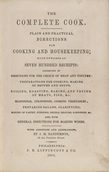 Both the Parkinson and Sanderson families were famous in Philadelphia for their culinary contributions. The Complete Cook and The Complete Confectioner were first issued separately (Parkinson in 1844; Sanderson in 1843); the first combined printing was in 1849. Copies of all three variations were very popular and went through more than a dozen printings through the 1860s.