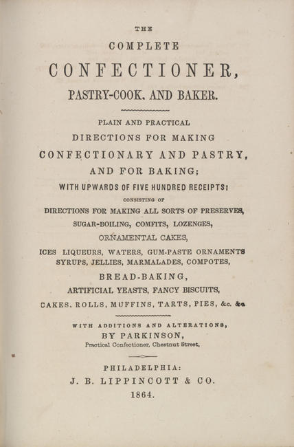 The Complete Confectioner, Pastry-Cook, and Baker: Plain and Practical Directions for Making Confectionary and Pastry, and for Baking; With Upwards of Five Hundred Receipts . . .With Additions and Alterations by Parkinson, Practical Confectioner, Chestnut Street.