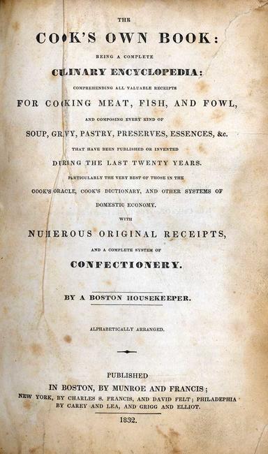 The Cook's Own Book: Being A Complete Culinary Encyclopedia: Comprehending All Valuable Receipts For Cooking Meat, Fish, And Fowl, And Composing Every Kind Of Soup, Gravy, Pastry, Preserves, Essences, &c. That Have Been Published Or Invented During The Last Twenty Years. Particularly The Very Best Of Those In The Cook's Oracle, Cook's Dictionary, And Other Systems Of Domestic Economy. With Numerous Original Receipts, And A Complete System of Confectionery. / By A Boston Housekeeper.