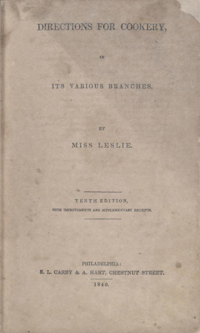 This was one of the most popular of 19th century cookbooks. It was first published in Philadelphia in 1837 and went through many editions (with varying titles), including a 60th printing published in 1870, 13 years after Leslie had died. In fact, this last edition was itself reprinted as late as 1892. This book was so popular that when her publishers issued her subsequent titles [See 1847 The Lady's Receipt-book], they took pains to indicate that the new book was "supplemental" to Directions and had all new recipes.