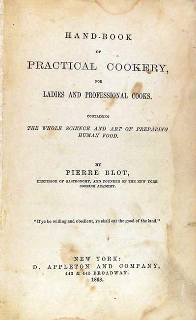 His two major books were What To Eat and How to Cook It (New York 1863) and this one, Hand-Book of Practical Cookery in 1867. In the years between the publication of these two books, Blot captured the imagination of the American media and the American public. In 1865 he opened Professor Blot's Culinary Academy of Design in New York City, arguably the first French cooking school in America.