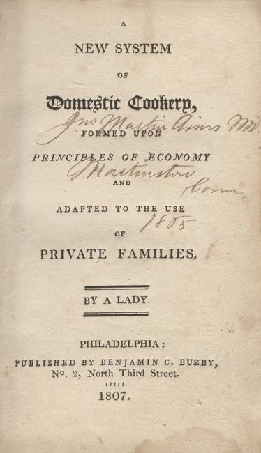 The American publishing history is as difficult to unravel as is the English. In America, it was issued under varying titles (A New System of Domestic Cookery, Formed upon Principles of Economy and adapted to the Use of Private Families; Domestic Cookery, and The Experienced American Housekeeper). Sometimes it was attributed to "A Lady"; sometimes to Mrs. Rundell (with varying spellings of her name) and sometimes, simply anonymous.