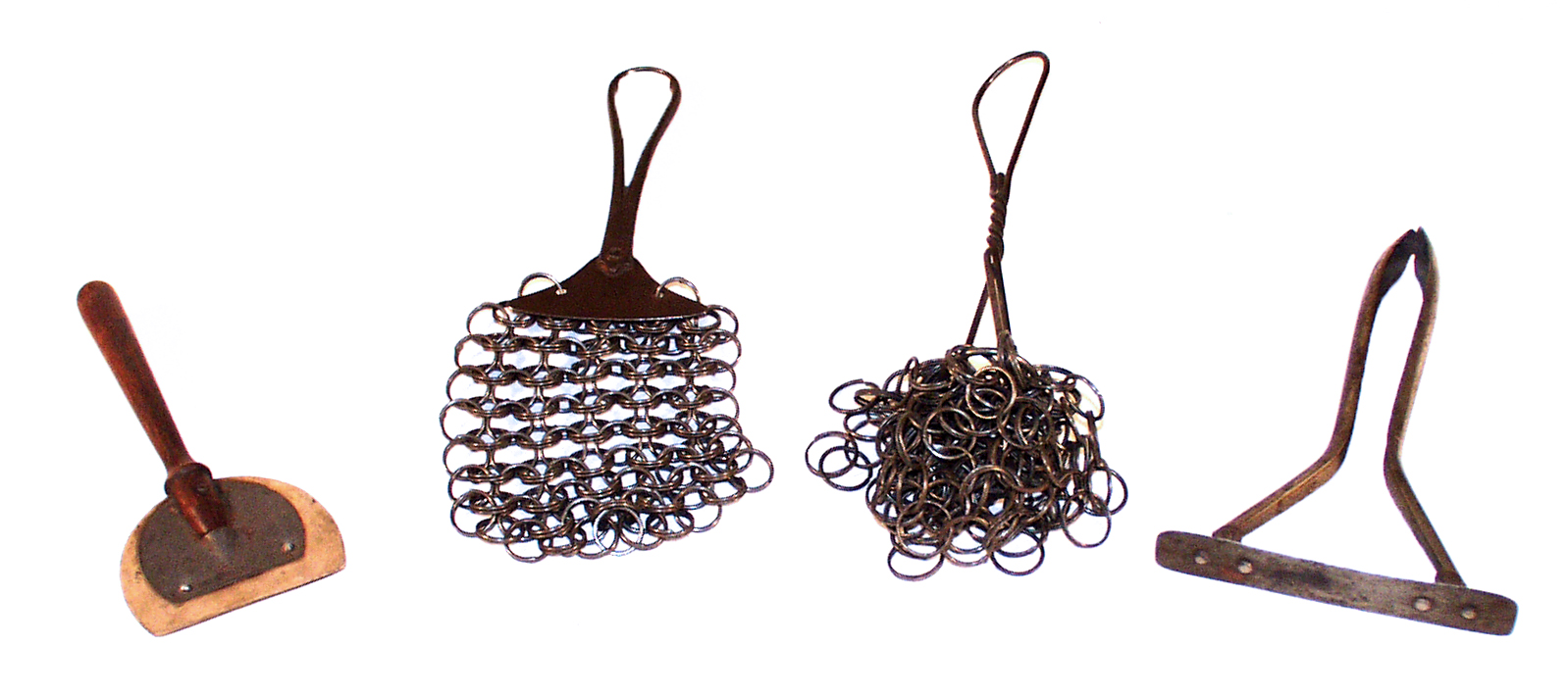 These examples (from left to right): a plate scraper, two pot chains or pot scrubbers, and a pot scraper. The plate scraper consisted of a wooden handle and a hard rubber disk attached to the handle with a piece of tin. The scraper was used to remove leftover food from plates. Pot scrubbers like these, available with or without a handle, were made of flexible chain mail and used to scrape cooked on food from the contours of pots and kettles. Pot scrapers like this one were made of metal. When the user squeezed the handle, the metal piece was bent and could then conform to the contours of the pot being scraped.