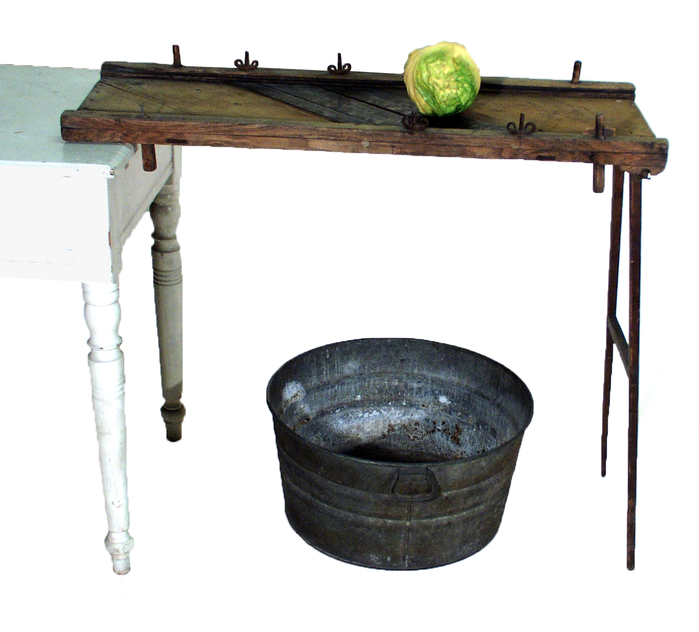 From Mrs. Lincoln's Boston Cook Book by Mary Johnson Bailey Lincoln (1884): This slicer consists of a long wooden frame which contains a steel cutting blade in the center. When a vegetable is to be cut, the frame end must be braced in some way, e.g., against a wall or place on two chairs with a galvanized tub beneath and a second person bracing the chairs. The vegetable is pushed across the blade and slices fall into a receptacle below. Sometimes slicers allowed the user to adjust the blade to change the thickness of the slice, which might be important when the vegetable being cut is thin potato or cucumber. Often accompanying a slicer such as this one is a wooden block or frame which is used to safely hold smaller vegetables.