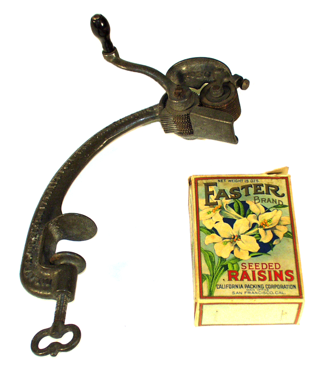 This is in the category of pitters and seeders and many examples were available by the middle of the 19th century, each an attempt to improve on what was available. Pitters and seeders were an inventor's dream. This ingenious little machine was used to take seeds out of raisins. Today most of the grapes and raisins variants are grown seedless, but only a few decades ago this was not the case. In the 19th and very early 20th century, raisins came with seeds. To extract them you needed a seeder, which was used in the home. The instructions embossed on metal frame of this seeder are "wet the raisins." The seeder is meant to clamp onto the edge of a table. Then the raisin was placed in the "cup" on top, the handle was turned to move two wheels that moved in opposite directions. One wheel has small spike-like extrusions and is of metal, the other is made of what looks like a hard rubber. The last patent date on this seeder is 1895. The seeder appears at left with a box of "Easter Brand Seeded Raisins from California." There isn't a date on the box, but being able to purchase seeded raisins would have been a new development.