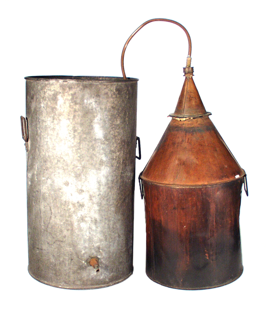 Distilling alcohol without a license is against the law in the United States. Today it is illegal for private individuals to even own a still. However, immigrants to this country at the turn of the 20th century were accustomed to preserving fruits, not only by canning and making preserves, but also by fermenting and then distilling them into liquor with the aroma and taste of the fruit. This was especially the case for people from central and eastern Europe for whom alcoholic liquors were an integral part of their social life and culture. These people continued the practice of distillation here. Even during Prohibition (which outlawed alcohol), distillation was active in some communities. People recall the aroma of fermenting fruit wafting from certain homes in their neighborhoods when stills were being used. Judging from the size of this still, it was probably used in a home on top of the kitchen stove. The apparatus consists of three pieces: the copper vessel is placed on heat to cook the fruit. The resulting steam from the fruit moves through the copper tube (which is surrounded by cold water). This change in temperature causes the steam to vaporize and the resulting liquor drips out of the spigot and is collected in bottles.