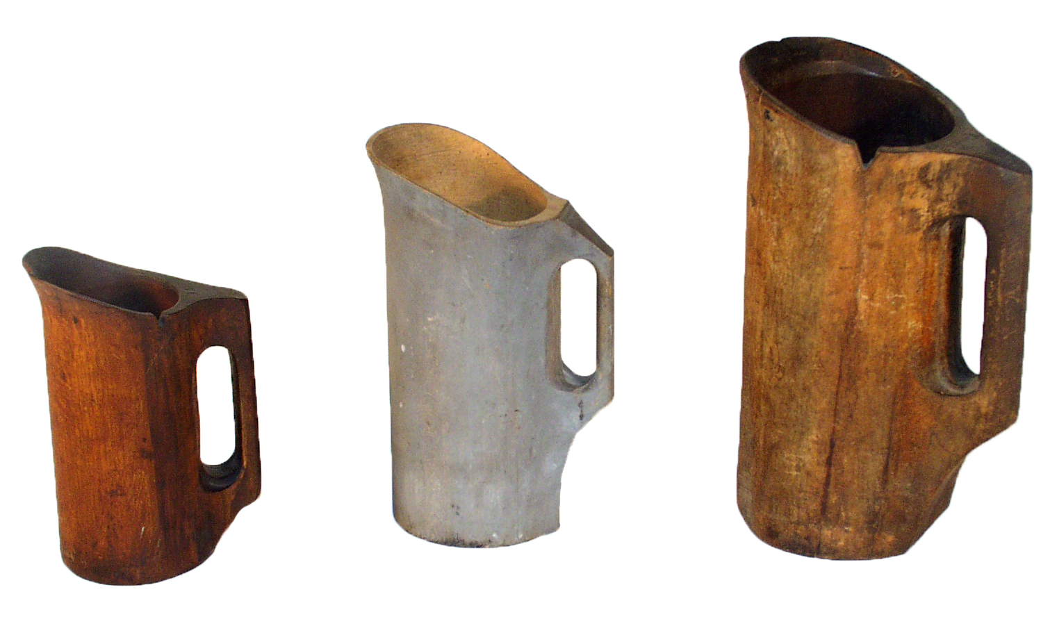 These are three different sizes of wooden measures from at least the late 19th century. From left to right: pint, quart, half gallon. Each was scraped and hollowed from a single piece of wood. It is likely that they were machine made. The notches on the rim functioned to regulate the amount of liquid in the vessels (visible on smallest and largest).