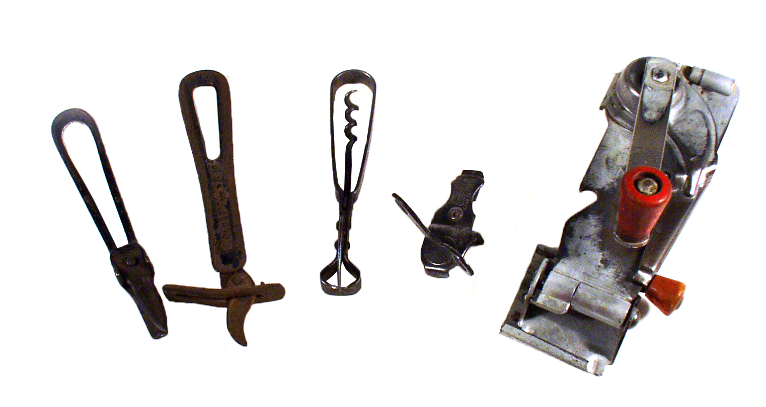 Like the can openers of today, these variations on this common kitchen tool were used to open cans of food. From left to right: manually operated-cast handle, forged steel blade, from mid-19th century; another from mid 19th century; with cork screw-this style is still available today. These types are worked by pulling the blade up and down around the edge of a can. Another still available today, the blade cuts along the edge of the can as the handle is turned; an example of a can opener that is fastened to the wall and worked by turning handle.