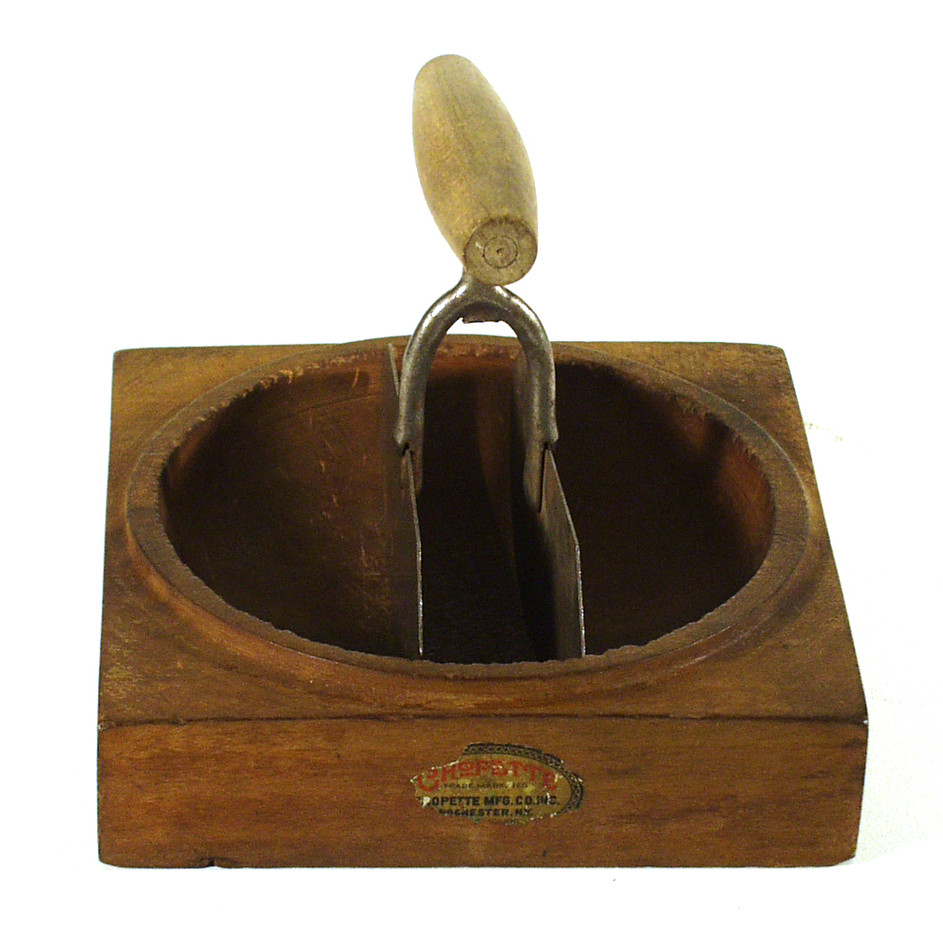 This chopper (sometimes called a mincer) consists of a single wooden handle attached to a hand made, double crescent bladed knife. Accompanying this tool is a wooden chopping bowl which is made to fit the rounded metal blades of the chopper. Foods were placed into the bowl and the cook then used the blades to chop or mince them Miss Parloa, however, didn't like this type of chopper. She states, "A chopping knife with only one blade is much better than one with two blades. The blade should be almost straight across. When it is rounded a good deal, much time and strength are wasted in chopping" (Kitchen Companion, 1887). She would much have preffered food chopping knives.