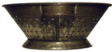A colander is a bowl-shaped utensil used as a strainer to drain cooking liquids from solid foods. It has holes in the bottom and ear-shaped handles on the sides. The colander shown here is made of tin. Aluminum, earthenware and graniteware were also used.