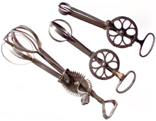 A popular technological advance in American kitchens, the Dover egg beater, also used for whipping cream or making mayonnaise dressing as well as beating eggs, replaced various other techniques for whipping egg whites. The beater was composed of wire blades attached to two small, cogged wheels. These cogs fit the cogs of a larger wheel turned by a handle, known as the "wheel and axle construction." One rotation of this handle resulted in five rotations of the wire blades. The Dover Egg beater produced a fine close texture because it was not lifted from the mixture while operating and therefore beats less air in than other types of eggbeaters.