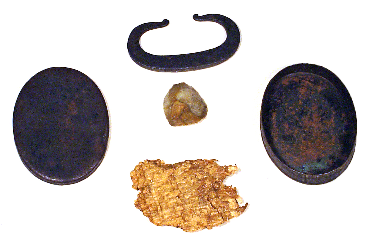 In lieu of matches, flint and steel were used to start a fire by rubbing them together to create sparks. Starting a fire with flint and steel requires practice and skill. The flint and steel were held over a small bundle of kindling (such as dry leaves or a bit of rag) and struck together in order to create a spark that would fall down into the kindling. Once a spark had begun to smolder in the kindling, the person attempting to start a fire would gently blow on the embers and add bits of larger kindling in order to create a flame. This object includes a flint (the stone) and steel (a "C" shaped piece of metal) along side a bit of rag and the oval shaped box it was stored in.