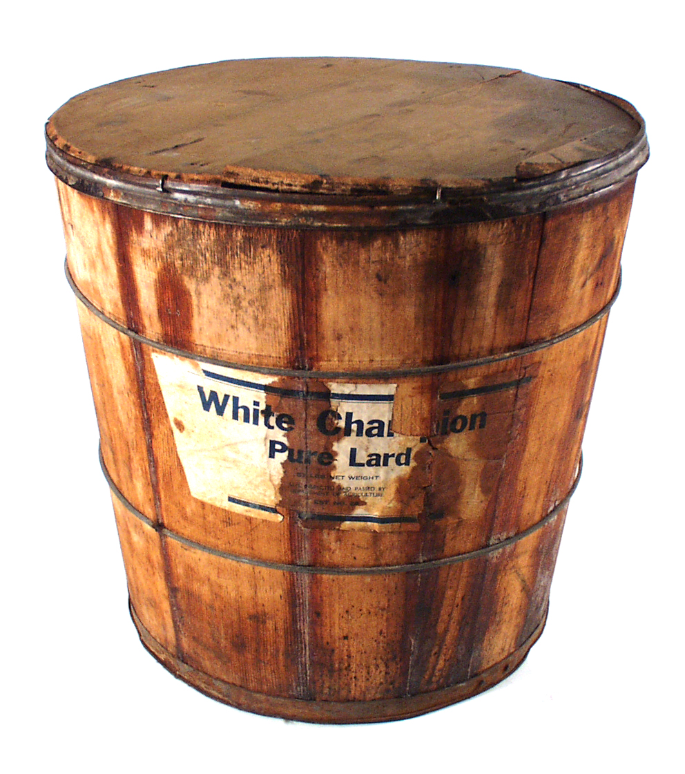 This wooden container, in which lard was stored, came out of a turn-of-the-century country store in Michigan in the 1940s. The lard barrel is made of cedar, and is bound with heavy wire hoops and metal bands around the bottom edge and top rim. The label reads "White Champion Pure Lard."