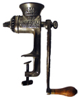 This labor-saving devices was created in order to grind meat for use in such things as sausages. The machine was designed to be clamped onto the edge of a table or counter using the clamp at the bottom. Meat was then fed into the cup-like receptacle at the top and the wooden handle was turned, causing the blades inside to move and the meat to be fed down into the machine. The resulting ground meat was then expelled through the side opposite the handle.