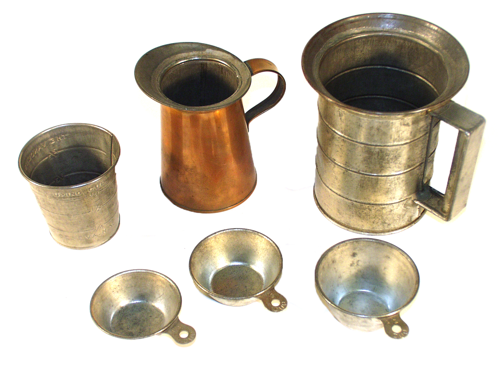 These are various sizes of copper and tin liquid measures. Just like modern day measuring cups, these metal vessels were used to measure out units of liquids to be used in recipes.