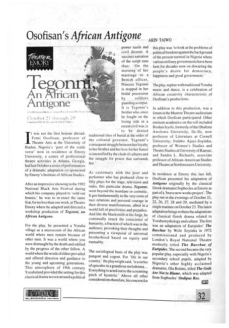 A review of the production at Emory University, Atlanta, Georgia, of Femi Osofisan's drama Tegonni, an African Antigone.