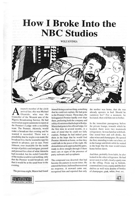 The famous Nigerian dramatist Wole Soyinka tells how he "broke into the Nigerian Broadcasting Service (NBC) studios in Ibadan and switched Western Premier, Chief Ladoke Akintola's priorly recorded statewide broadcast tape for another tape.