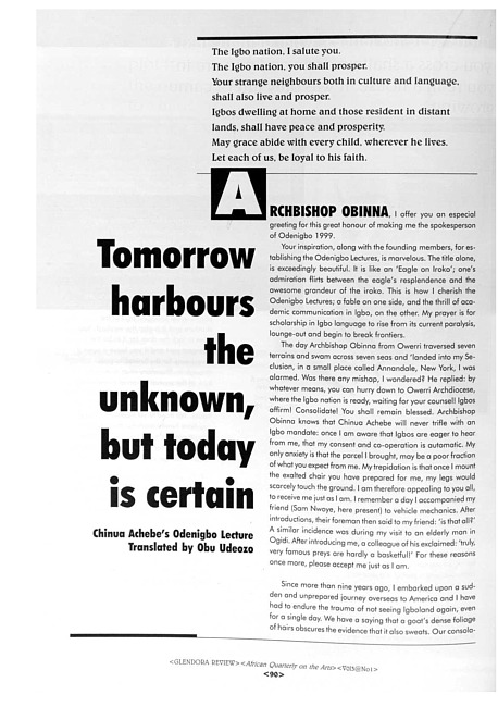 Tomorrow harbours the unknow, but today is certain : Chinua Achebe's Odenigbo lecture translated by Obu Udeozo