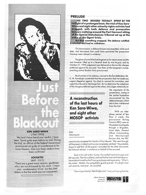 Just before the blackout : a recostruction of the last hours of Ken Saro-Wiwa, and eight other MOSOP activists