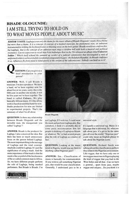 Interview recorded 24 February 1995 in Lagos, Nigeria between Glendora Review and Nigerian musician Bsade Ologunde, about his life and music, Nigerian jazz, reggae, fuji and other musical style, performance, and other Nigerian musicians such as Fela Kuti.