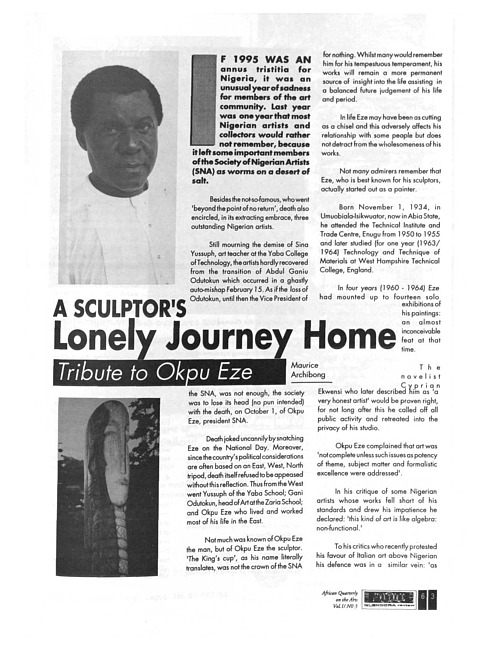 A sculptor's lonely journey home : tribute to Okpu Eze