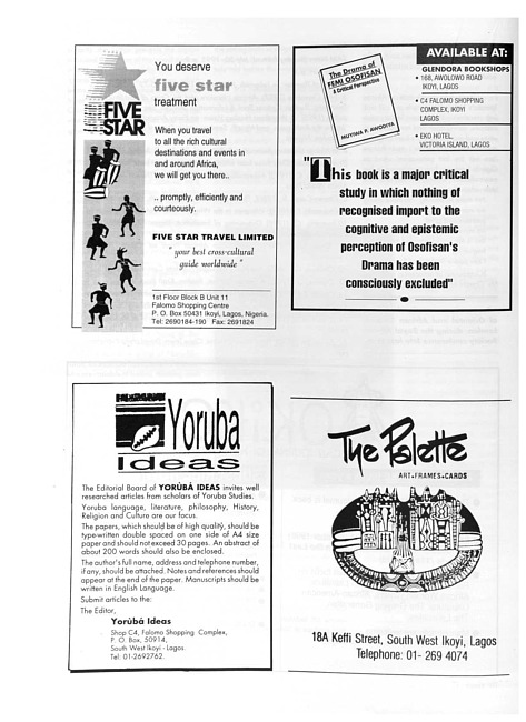 Five Star Travel Limited ; The drama of Femi Osofisan ; Yoruba Ideas ; The Palette