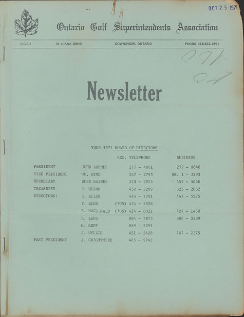 Ontario Golf Superintendents Association newsletter. (1971 October)