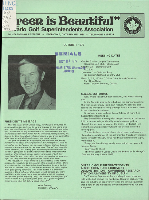 Guelph Turfgrass Institute, 328 Victoria Road South, Guelph, Ontario N1L 0H2; Phone: (519) 767-3341; Email: admin@ogsa.ca; Web: https://www.ogsa.ca/