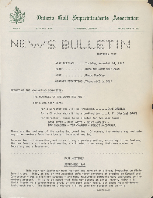 Ontario Golf Superintendents Association news bulletin. (1967 November)