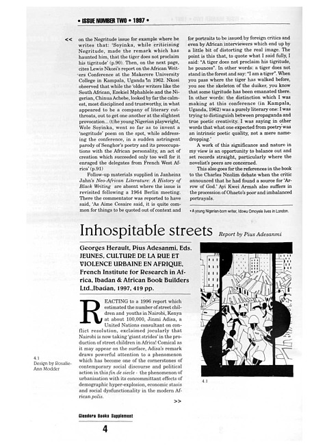 Summary of discussions happened at the symposium "Youths, Street Culture and Urban Violence in Africa" which is reported in the conference procedings "Jeunes, culture de la rue et violence urbaine en Afrique" edited by Georges Herault and Pius Adesanmi