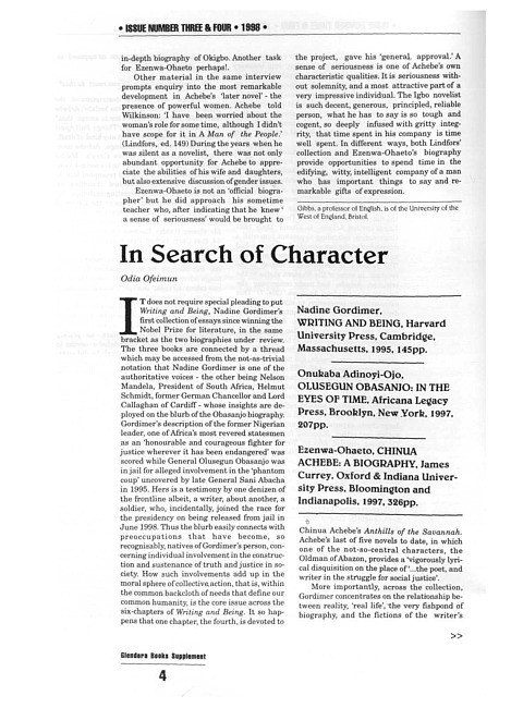 Review of: Nadine Gordimer. Writing and being. Cambridge, Massachusetts: Harvard University Press, 1995, Onukaba Adinoyi-Ojo. Olusegun Obasanjo: in the eyes of time. Brooklyn, N.Y. : Africana Legacy Press, 1997, and Ezenwa-Ohaeto. Chinua Achebe: a biography. Oxford: James Currey; Bloomington and Indianapolis: Indiana University Press, 1997
