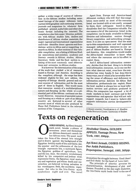Review of: Abubafear Gimba. Golden apples. New York, Vantage Press, 1997, and Ayi Kwei Armah. Osiris rising. Popenguine, Senegal: Per Ankh, 1995