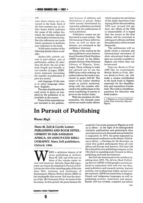 Review of: Hans M. Zell & Cecile Lomer. Publishing and book development in Sub-Saharan Africa: an annotated bibliography. Oxford: Hans Zefl publishers, 1996