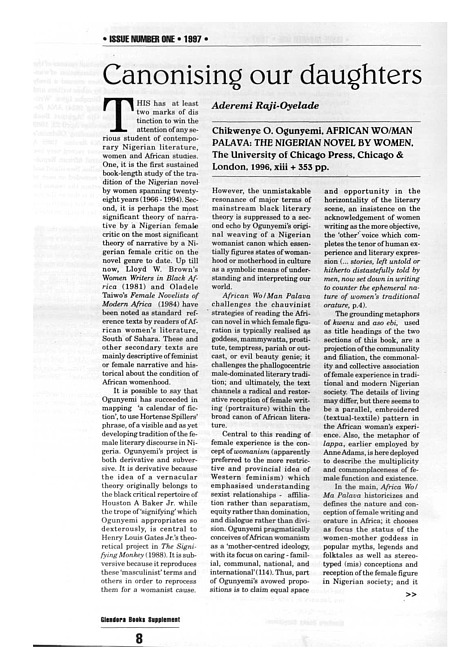 Review of: Chikwenye O. Ogunyemi. African wo/man palava: the Nigerian novel by women. Chicago; London: University of Chicago Press, 1996